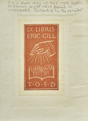 Eric Gill's copy of the 16th publication from St. Dominic's Press, featuring three woodcut devices attributed to him. This binding is not recorded in Evan Gill's bibliography, which calls for brown paper wrappers. This copy with a variant title-page, with a woodcut device of an angel on a horse (matching Evan Gill's own copy), instead of the St. Dominic's Press cruciform device found in standard copies.