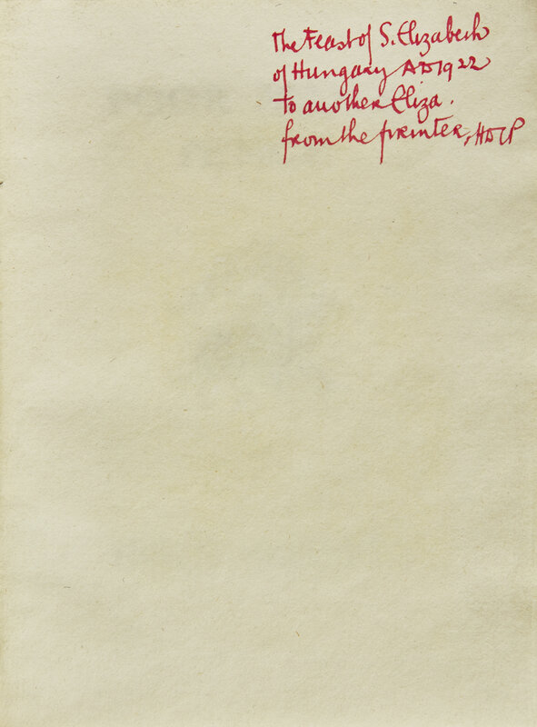 (Ditchling, Sussex: St. Dominic's Press, 1917). First edition. From the library of Eric Gill, and with his book-plate on front paste-down. Inscribed in red ink on front blank by the printer, H.D.C. Pepler: "The Feast of S. Elizabeth of Hungary A D 1922 to another Eliza. from the printer, HDCP". With woodcut device on title-page, attributed to Gill, and five in-text woodcut devices (three attributed to Gill). Original quarter linen over drab paper-covered boards; all edges trimmed. Gill 362