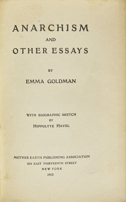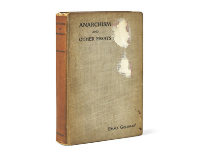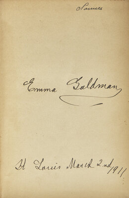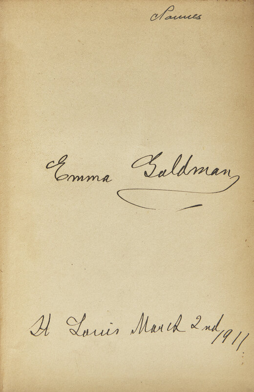 Rare inscribed first edition of Emma Goldman's first published book, a collection of her influential essays on anarchism and other topics. Signed in St. Louis in March 1911, during Goldman's annual lecture tour. In 1911 alone she visited 40 American towns in six months, and delivered over 150 lectures on subjects including "Tolstoy-Artist and Anarchist", "Galsworthy's Justice", "Marriage and Love", "Danger in the Growing Power of the Church", "Victims of Morality", and "Anarchism Versus Socialism".