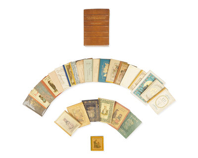 London: George Routledge and Sons, etc., 1883-1929. Complete set in 26 volumes (see list below). 24mo or smaller (some oblong). With color illustrations by Kate Greenaway. Publisher's various pictorial boards; scattered wear and soiling; scattered ownership or gift inscriptions; 1897 issue with pencil annotations at rear; first series (1883-97) in tan morocco and cloth case and two chemises. Schuster & Engen 3-22
