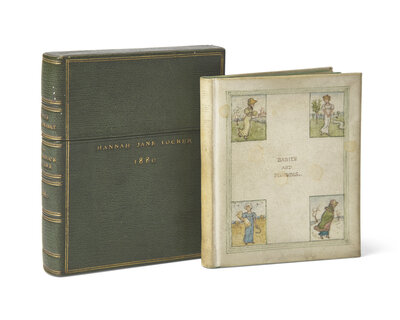 A wonderful and extremely charming illuminated miniature book, specially created by Kate Greenaway and poet Frederick Locker (1821-1895) as a birthday present for Locker's wife, Hannah Jane Lampson (1846-1915). Featuring four holographic poems by Locker, each on the subject of his children, and fully adorned with extensive watercolor and pen and ink illustrations by Greenaway decorating virtually every page.