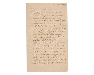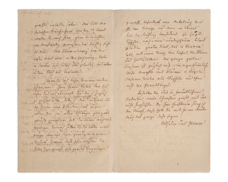 Cassell, Germany, December 12, 1819. One sheet folded to make four pages, 7 3/4 x 4 9/16 in. (197 x 116 mm). Autograph letter in German, signed by Wilhelm Carl Grimm (of the Brothers Grimm), to Annette (or Jenny) von Droste-Hulshoff, sending and describing in great detail a new edition of his and his brother, Jacob's fairy tales, illustrated by their younger brother, Ludwig Grimm. Lightly toned, split at center fold repaired with archival tape. From the Annette von Droste-Hulshoff autograph collection.