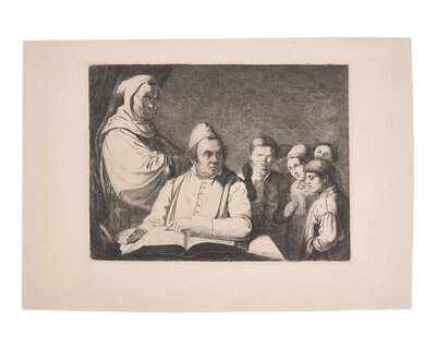 No place, ca. 1820. Etching on paper, 6 1/4 x 8 in. (image), 8 1/2 x 12 in. (overall). Depicting students standing behind their teacher. Light foxing to verso, adhesive residue from mounting to same. Stoll 171
