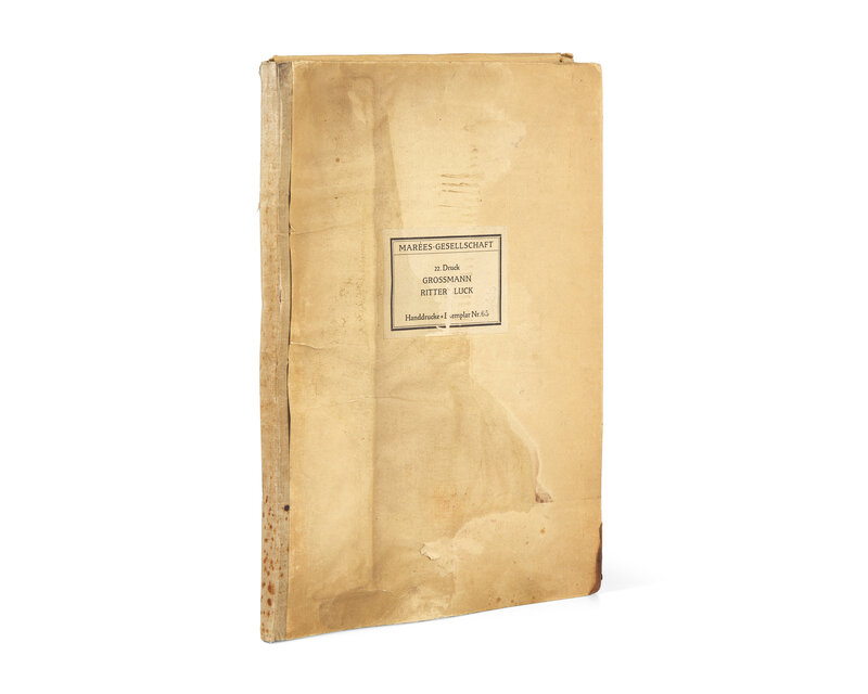 (Munich): Marées-Gesellschaft Piper, (1920). First and limited edition, #65/65 numbered copies. Folio. Illustrated with an original pen and ink drawing by Grossmann and 18 hand-colored woodcuts on Japan paper, each woodcut signed by Grossmann, and each blindstamped in bottom right. Each in mat, and loose as issued in quarter cloth over paper-covered board portfolio, printed paper cover label. Portfolio worn, soiled, and dampstained; portfolio flaps worn, lower flap detached but present; mat for original drawing slightly affected by damp, but drawing unaffected.