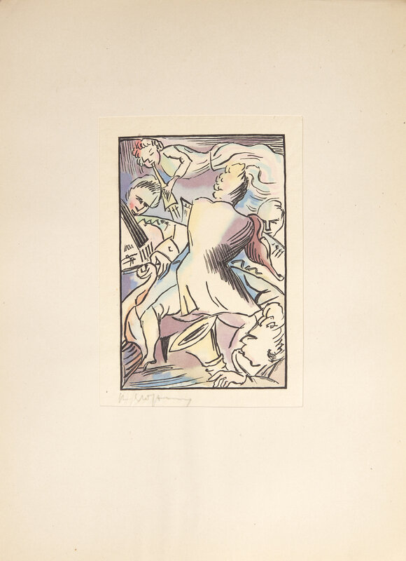 Limited edition suite of 18 hand-colored woodcuts, with an original ink drawing, by German painter and graphic artist Rudolf Grossmann, for his illustrated edition of E.T.A. Hoffmann's Ritter Gluck. This special edition of only 65 copies was issued alongside the limited edition of 200 copies by the Bremmer Presse, published in the same year.