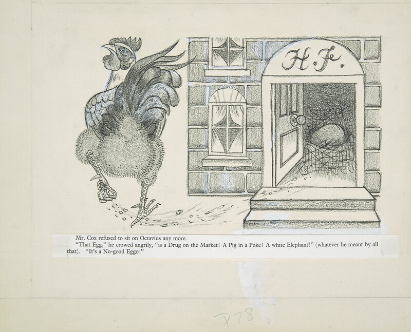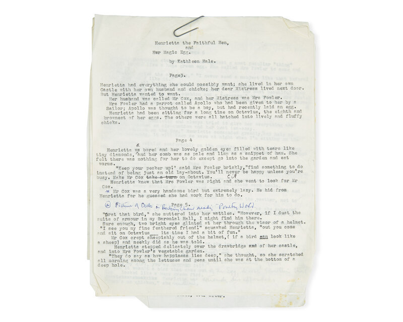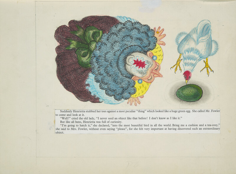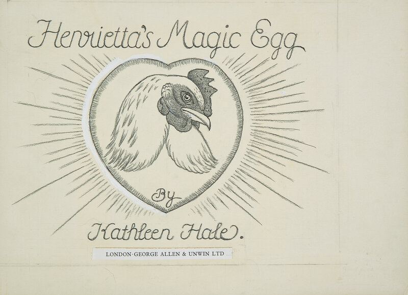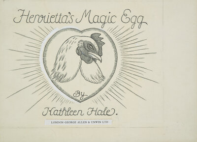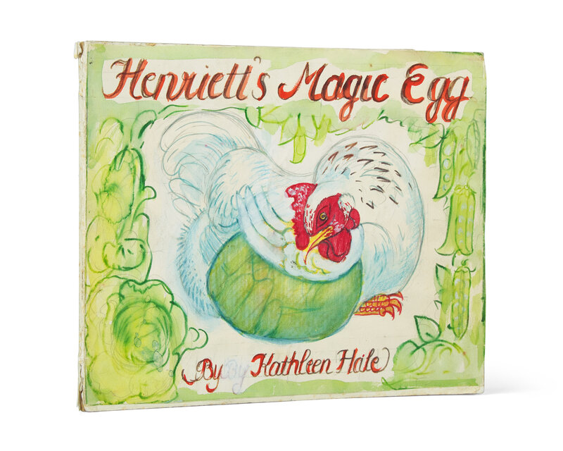 No place, ca. 1973. Set of 32 original illustrated story boards by Kathleen Hale, for her book Henrietta's Magic Egg, including the pictorial title-page and all 31 pages of the published book. Pen and ink, pencil, watercolor, and/or colored pencil or crayon on thick board; printed typescript mounted to each board, above or below images; tracing paper overlay, several with closed tears, toning, or detached; with autograph slip, by Hale: "These drawings are the originals for 'Henrietta's Magic Egg'..." Includes Hale's maquette booklet for the work, including illustrated front cover, mixed-media on paper (pencil, watercolor, crayon), with autograph pencil annotations, printing notes, corrections, etc.