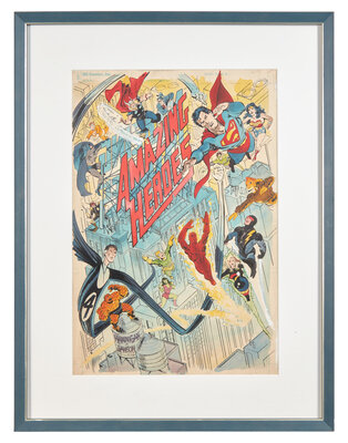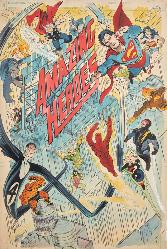Original cover art for Amazing Heroes No. 45, depicting DC's biggest superheroes, including Superman, Batman, Thor, The Fantastic Four, Wonder Woman, and many more.