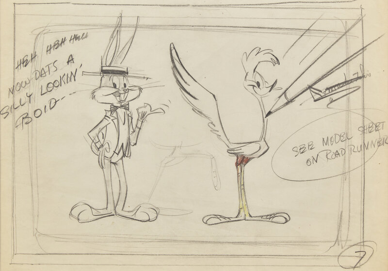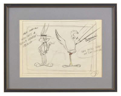 "Heh heh heh Now dats a silly lookin' boid" Original Sketch of Bugs Bunny and Road Runner, c. 1960s