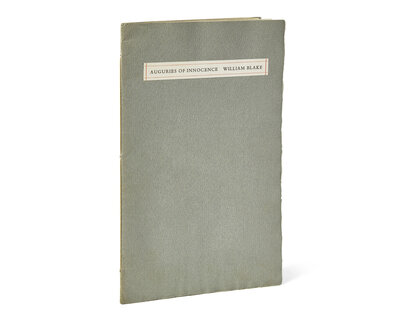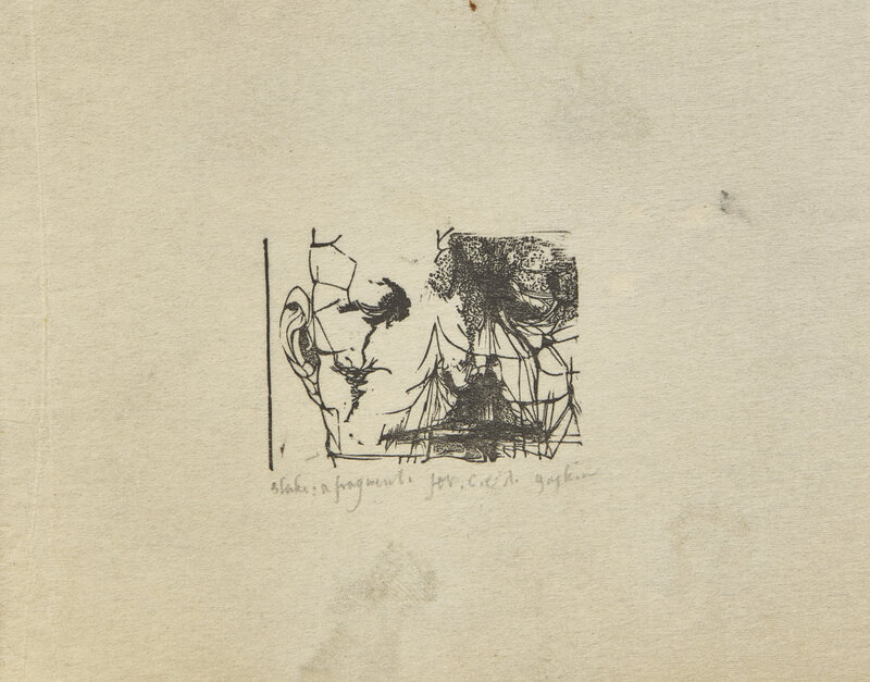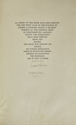 (Northhampton, Massachusetts): Printed for the Print Club of Philadelphia at the Gehenna Press, 1959. First and limited edition, one of 250 signed copies. Presentation Printers copy, inscribed on colophon: "For Charlotte & Arthur Vershbow/E(sther). & L(eonard)." and with an original inscribed engraving laid in ("Blake: A Fragment. for C. & A. Baskin"). 12mo. 10 pp. Containing eight woodcut illustrations by Baskin. Publisher's limp string-sewn light gray wrappers with printed label. The Vershbow's book-plate laid in. Fern & O'Sullivan 370-77