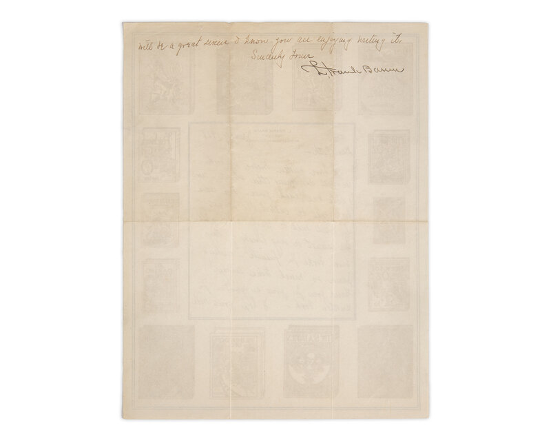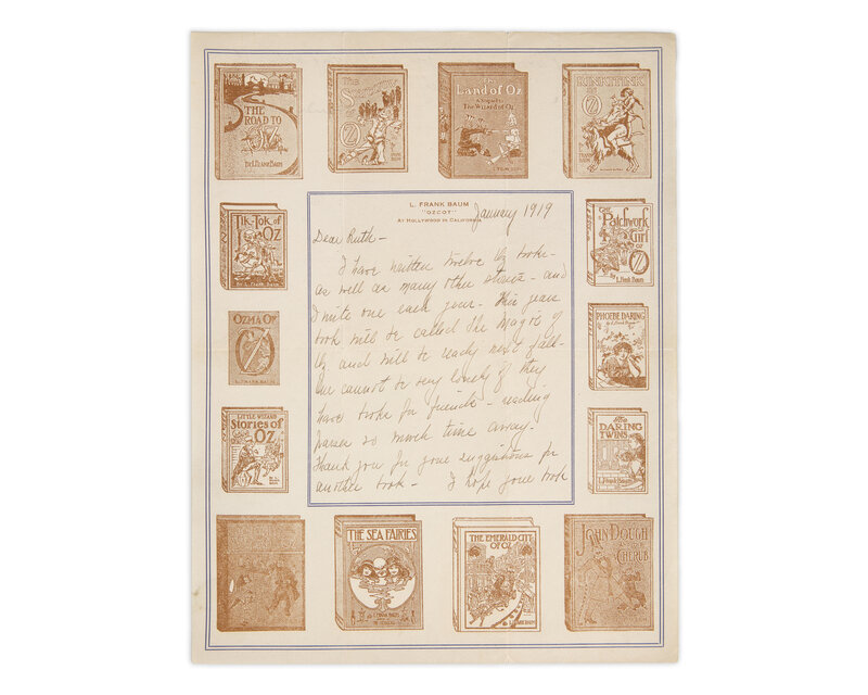 A fine letter of deep association, L. Frank Baum writes to Ruth Plumly Thompson--the children's book writer who was chosen by publisher Reilly & Lee to succeed Baum as the author of his beloved Wizard of Oz series. Prior to the discovery of this letter--written only four months before Baum's death--there was no known direct link between the two writers, and as such it provides perhaps a singular documentary connection between them, and serves as a prelude to the passing of the Oz-iana flame to a second generation.