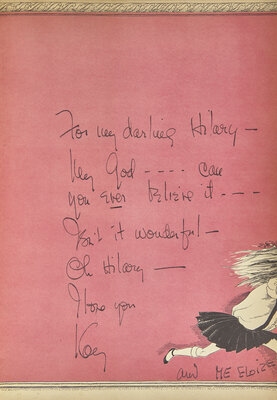 Keen to connect the two, Ryan arranged for them to meet at the Persian Room in the Plaza Hotel, in December 1954. "When Kay saw Hilary's drawing of the two little girls, she was intrigued. 'The prissy one Kay would call Dorothy Darling,' Hilary explained. 'The other suggested the wicked school girls of Ronald Searle.'" (Irvin, p. 206). From this meeting would blossom one of the greatest writer-and-illustrator collaborations in American publishing, and result in one of the most beloved characters ever put to page, the Plaza Hotel’s enfant terrible, Eloise.