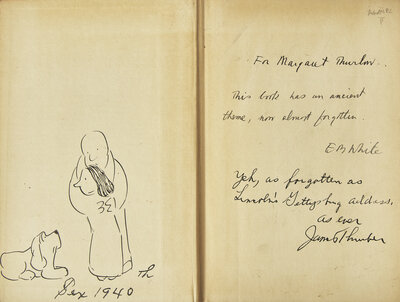 A charming presentation copy, inscribed by James Thurber and E.B. White to Margaret Thurlow, secretary and copy editor at The New Yorker. Thurlow worked in this position for 10 years, and among her many responsibilities, assisted the office manager in handling Thurber's correspondence from readers and publishers. Thurber and White joined The New Yorker staff in 1927, and it was White who discovered Thurber's drawings and had them first published. They would both contribute to the magazine for decades, and White would go on to publish such classics as Stuart Little (1945) and Charlotte's Web (1952).