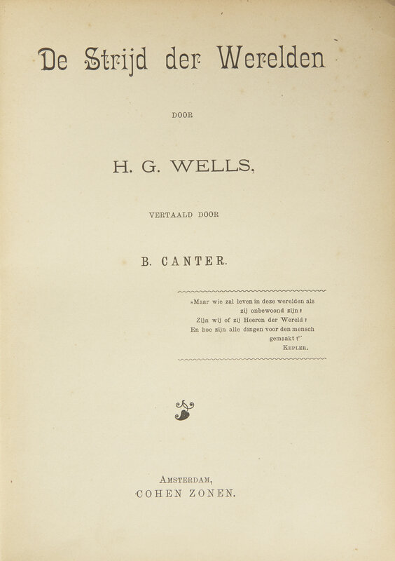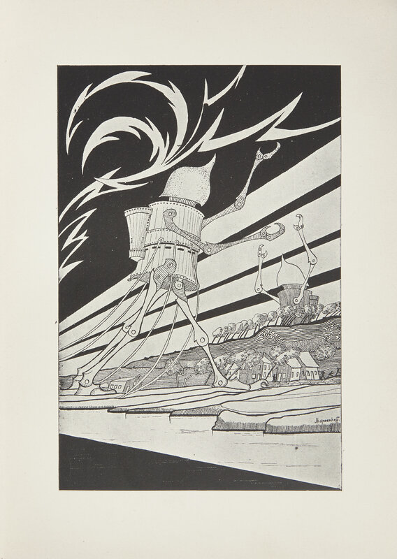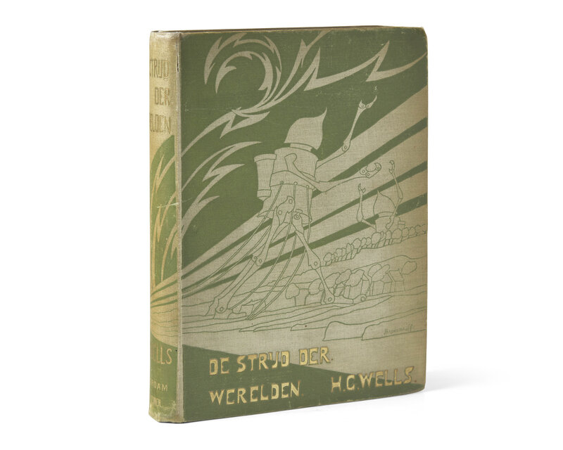Very rare illustrated edition of H.G. Wells's classic science fiction novel, The War of the Worlds. Wells's story first appeared in nine issues of Pearson's Magazine in 1897-98, and featured illustrations by Warwick Goble. These same illustrations were reprinted in the first American edition, published in 1898. The first and second English editions, published in London in 1898 and 1899, were not illustrated. This Dutch translation, published in 1899, is thus the first book-form edition to feature original commissioned illustrations, and were created by poet, cabaret singer, and artist J.H. Speenhoff (1869-1845). Inspired by the works of Edward Tennyson Reed, Degas, and Caran D'Ache, Speenhoff's fantastical and proto-psychedelic illustrations here evoke a world unlike any seen for the work of Wells.