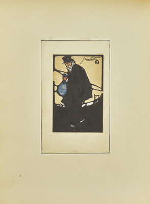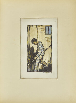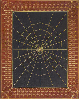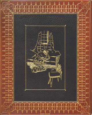 New York: Brentano's, no date (ca. 1898). Original 8vo sheets inlaid to heavy quarto leaves. Illustrated with 19 original illustrations in pen and ink, graphite, gouache, and watercolor, by Isabel Lyndall, George Gibbs, Walter Faucett, F.V. Wilson, E. Horter, H.S. Pullinger, M.C. Craven, James Preston, T.H. Wilkinson, J.L.G. Ferris, Victor Bruce, D. Wiggins, and others; several text leaves adorned with additional pencil and watercolor drawings. Finely bound in brown morocco, grey morocco panel on front cover, pictorially decorated in gilt, and with light brown, black, and orange onlay, depicting a prison yard scene; spine lettered in gilt and with four red morocco heart-shaped onlay; all edges gilt; elaborate gilt and blue morocco pictorial dentelles, depicting a prisoner kneeling in their cell at front and of a spider web at rear; light blue moiré silk endleaves; by Hyman Zucker; scattered light spotting and offsetting to text; original cloth bound in at rear.