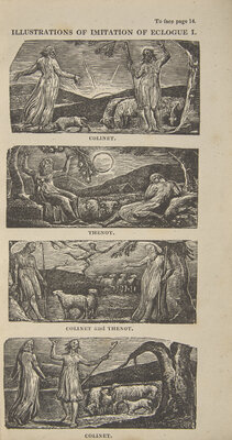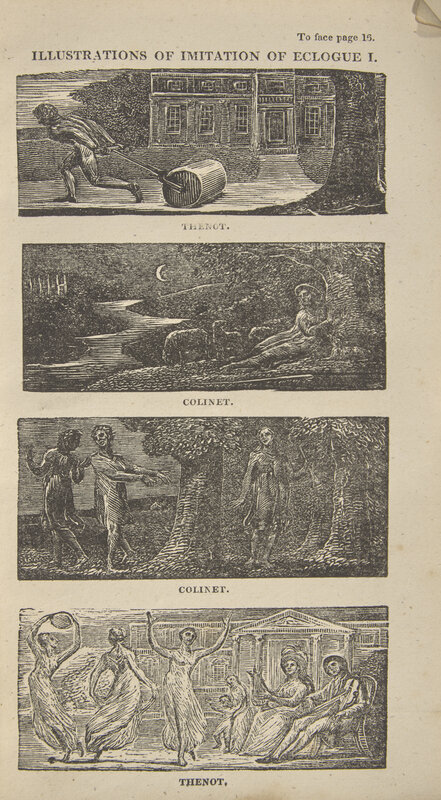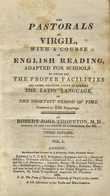 A lovely set of Robert John Thornton's translation of Virgil, the first edition with illustrations by William Blake, and Blake's first foray into the medium of wood-engraving. Although Thornton was critical of Blake's work, deemed by him to be unconventional, he nonetheless included them at the behest of John Linnell--Blake's patron-- Sir Thomas Lawrence, and others. Beneath the frontispiece for the "Imitation of Eclogue I" (facing p. 13), Thornton has written, "The illustrations of this English Pastoral are by the famous Blake, the illustrator of Young's Night Thoughts and Blair's Grave; who designed and engraved them himself. This is mentioned, as they display less of art than genius, and are much admired by some eminent painters." Blake's wood-engravings proved to be some of his most influential work, inspiring the likes of George Richmond, Edward Calvert, and Samuel Palmer, the latter who called them, "visions of little dells, and nooks, and corners of Paradise."
