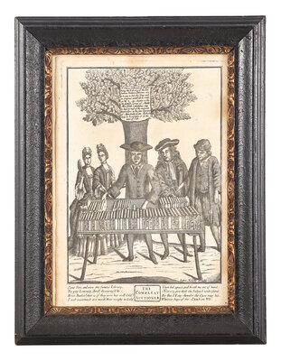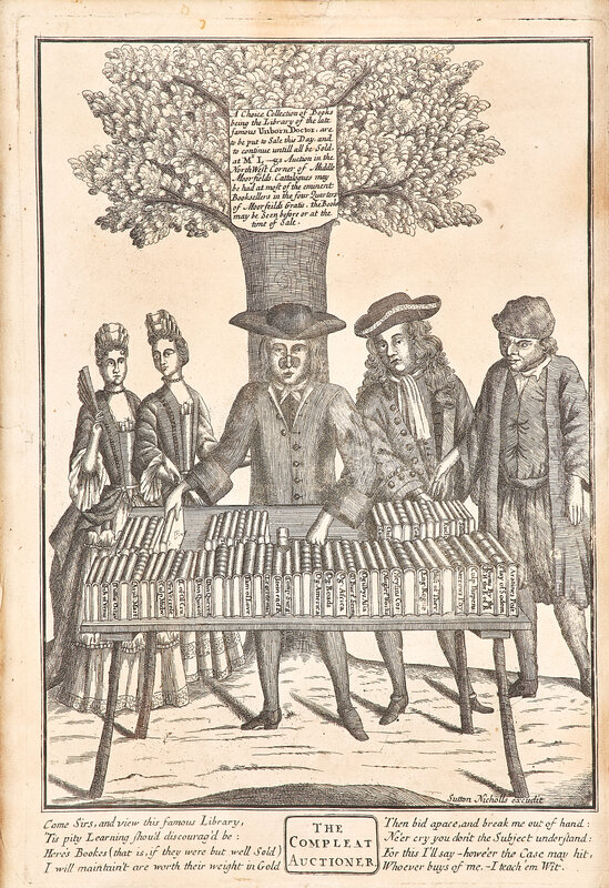 A very rare engraving of the earliest printed depiction of a book auction. Engraved by London draughtsman Sutton Nicholls, the print shows an open air book auction in Moorfields, with a group of men and women perusing a table lined with dozens of soon-to-be auctioned books. Above the figures hangs a sign reading, "A Choice Collection of Books being the Library of the late famous Unborn Doctor, are to be put to Sale this Day, and to continue untill all be Sold...Cattalogues may be had at most of the eminent Booksellers in the four Quarters of Moorfeilds Gratis. the Books may be Seen before or at the time of Sale..." The books that line the stall's table show remarkable breadth, including esteemed works like Peter Heylyn's Cosmographie, to works of religious radicalism by Lodowicke Muggleton, censored works like Richard Head's The English Rogue, erotic works like the Play of Sodom, The School of Venus, or The Ladies Delight, and Aristotle's Masterpiece, as well as others like Thomas Middleton's The Family of Love, standard medical works of the period like Culpepper’s Compleat and Experience’d Midwife, and various titles including Don Quixote and John Ogilby's America. Below the image is a printed eight line satirical verse: "Come Sirs, and view this famous Library, 'Tis pity Learning shou'd discourag'd be: Here's Bookes (that is, if they were but well Sold) I will maintain't are worth their weight in Gold Then bid apace, and break me out of hand: Ne'er cry you don't the Subject understand: For this I'll say--howe'er the Case may hit, Whoever buys of me,-I teach 'em Wit."