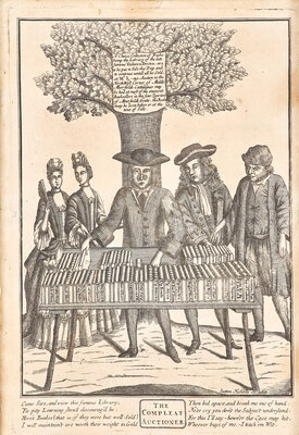 Book auctions first gained popularity in 17th century Netherlands and Italy, with the first appearing in England in 1676. As Brian Cowan notes, this print reflects a satiric response to this emerging market, and was created to skewer "the pretensions to learning harbored by both the auctioneers and their many customers". As he explains, "the auction was a prominent target of satire because it offered such a public display of the buying and selling of precious objects that were thought to be outside the gritty realm of commerce." (Cowan, The Social Life of Coffee, 2008, pp. 141-142). This satiric nature is exhibited in the verse below the image, and is alluded to in the name of the collector whose books are to be auctioned, the so-called "Unborn Doctor". This name also appears in a contemporary engraved broadside, "The Speech of Waltho Van Claturbank" (1700), and whose usage appears "to have represented a not uncommon pretension of quacks at this period" (BM 1415).