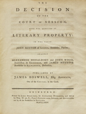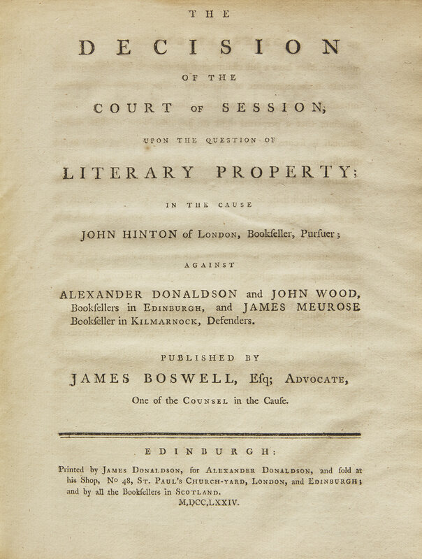 Boswell, James. The Decision of the Court of Session, Upon the Question of Literary Property; In The Cause John Hinton of London, Bookseller, Pursuer; Against Alexander Donaldson and John Wood, Booksellers in Edinburgh, and James Meurose Bookseller in Kilmarnock, Defenders. Published by James Boswell, Esq; Advocate, One of the Counsel in the Cause