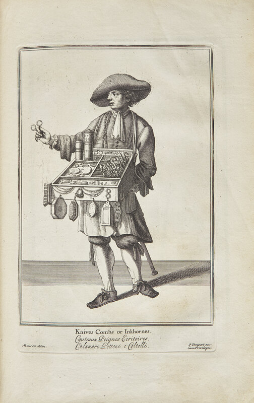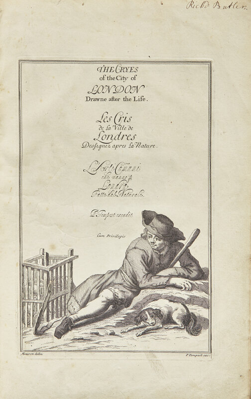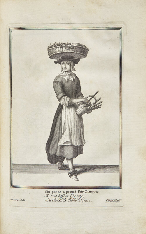 A rare and early complete edition of Pierce Tempest's Cryes of the City of London, featuring numerous finely engraved plates depicting London's street peddlers, performers, hawkers, merchants, and other characters. Based on designs by Dutch engraver Marcellus Laroon, Tempest first published this work in 1687 with an unspecified number of plates. It was frequently enlarged by Tempest over the next three years, in 1687/88 (40 plates), 1688 (60 plates), 1688 (72 plates), and finally, in 1689 (with 74 plates). The last known edition published by Tempest was in 1709, with the plates then passing to Henry Overton, ca. 1711 or later. The earliest editions, such as this copy, have unnumbered plates (Overton added numerals and his imprint to his editions), although some plates in this copy are watermarked "P IOLLY", who, according to Shesgreen, "worked only between 1699 and 1715 (p. 261). In 1760, these plates passed to Robert Sayer, where they were reworked.