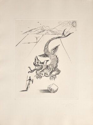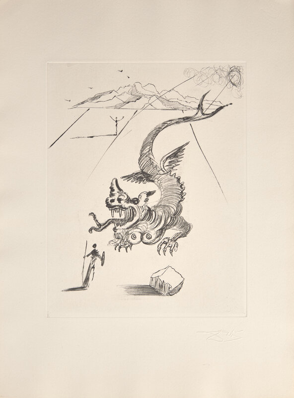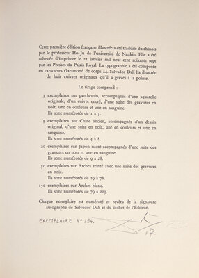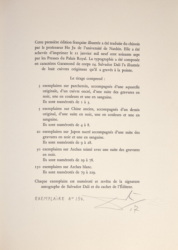 Paris: Editions Argillet, 1967. First and limited edition, #154/150 numbered copies on Arches paper, signed and dated by Salvador Dali (from a total edition of 229). Folio. Illustrated with eight heliogravures reworked in drypoint by Dali, with his embossed signature below each image, and with two plates of Chinese calligraphy, one printed in black and red, the other embossed. Gatherings loose as issued in paper chemise; in original gray cloth fall-down-back box and chemise, lettered in gilt, lightly worn. Michler & Löpsinger 209-216
