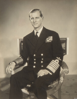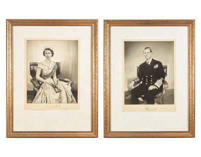 London, ca. 1953. Pair of signed black and white portrait photographs, one of Queen Elizabeth II, by Dorothy Wilding, 16 1/4 x 12 3/4 in. (419 x 324 mm), and the other of her husband Prince Philip by Baron (Sterling Henry Nahum), 16 1/2 x 12 in. (419 x 305 mm). Both signed below image and dated 1953. Scattered light stains to mats. In matching gilt frames, 26 1/2 x 20 1/2 in. (673 x 520 mm).