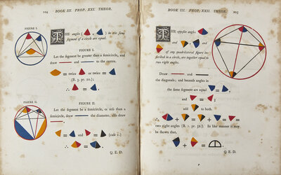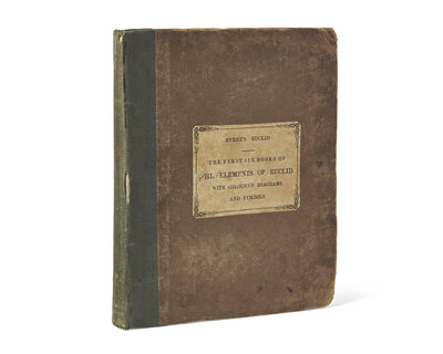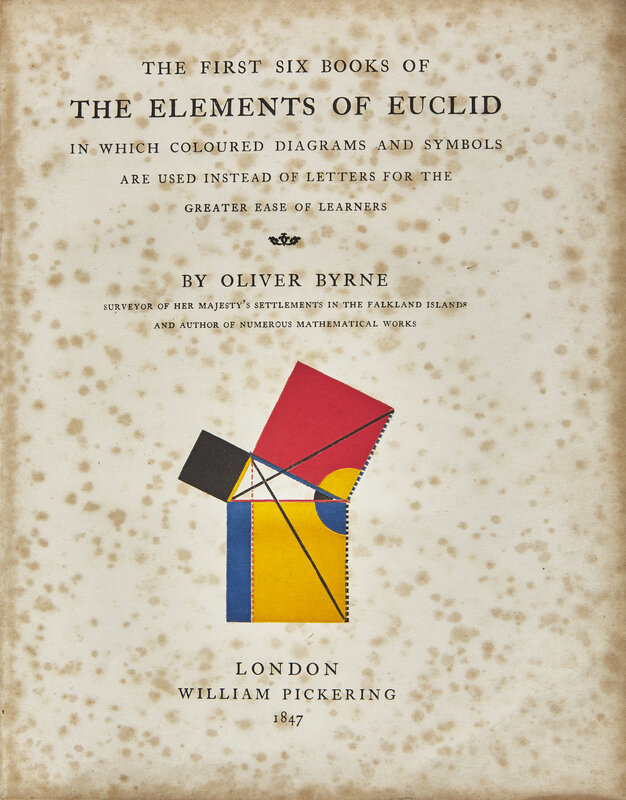 Oliver Byrne's innovative edition of The Elements of Euclid, one of the most reprinted books of all time, and instrumental to the foundation of modern mathematical theory. Here printed with geometric figures and shapes in bright primary colors, considered "a masterpiece of Victorian book design, considered 'one of the oddest and most beautiful books of the whole century" (McLean).