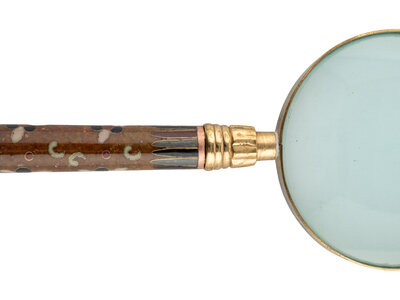 comprising a miniature knife box and three eyeglass cases, together with a Japanese cloisonné magnifying glass; 5 items total.