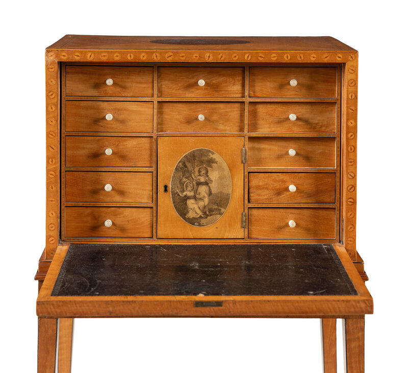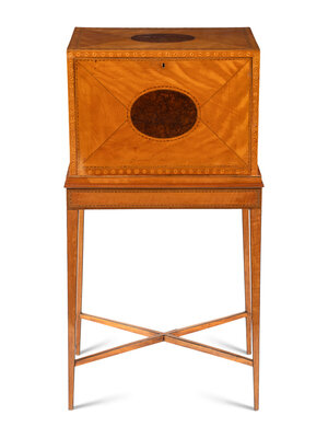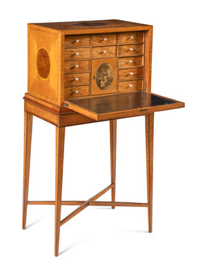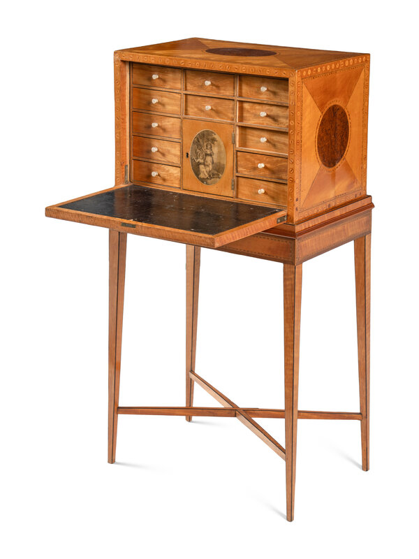 A George III Satinwood, Yew Wood and Marquetry Fall-Front Writing Cabinet on Stand