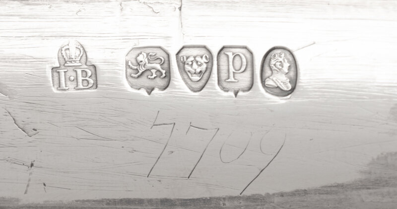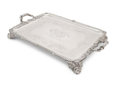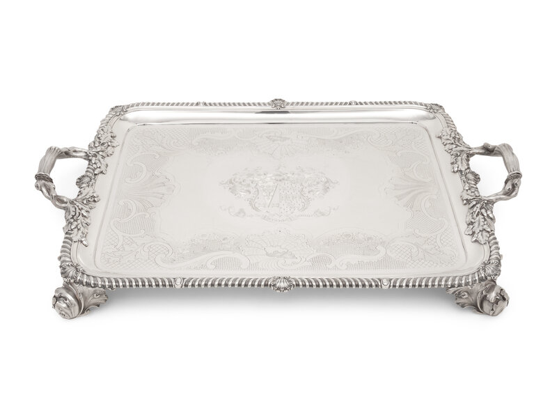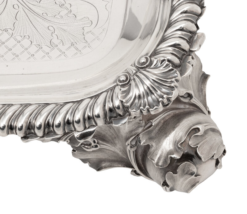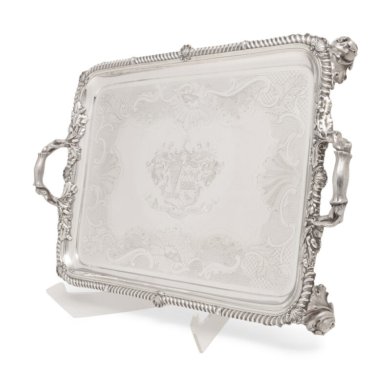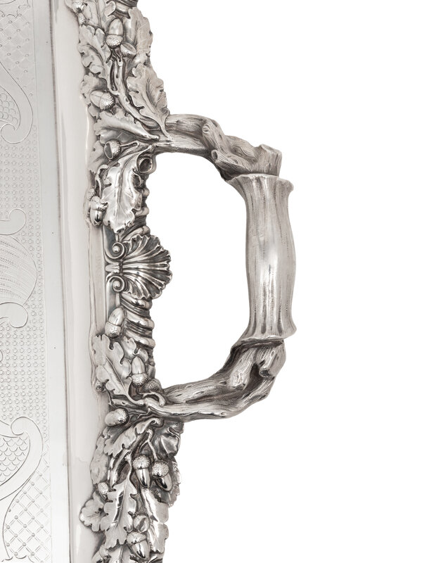 modeled with realistic branch-form handles, a gadroon border spaced with shells, and oak leaves with acorns; the surface engraved to depict acanthus leaves and shells, centered by a coat of arms and the motto DUM SPIRO SPERO.