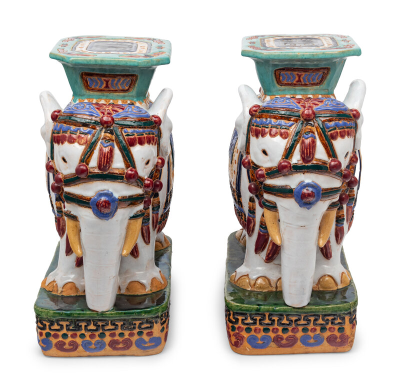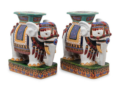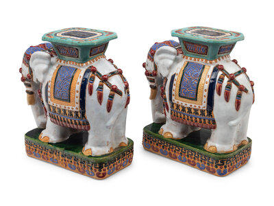 A Pair of Polychrome Glazed Terracotta Elephant-Form Garden Stools