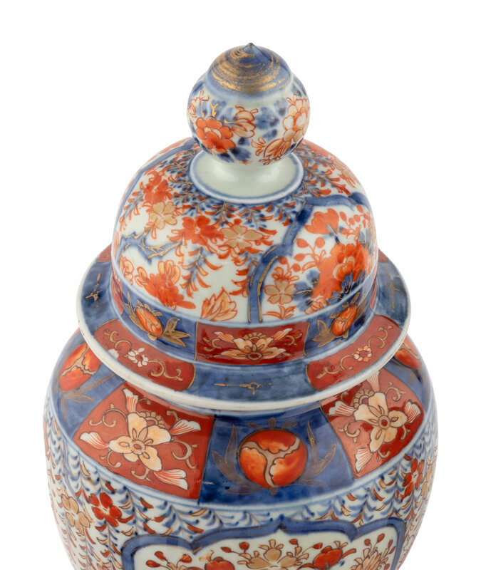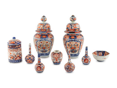 comprising three covered jars, a small jar (lacking lid), four small bottle vases, and one bowl.