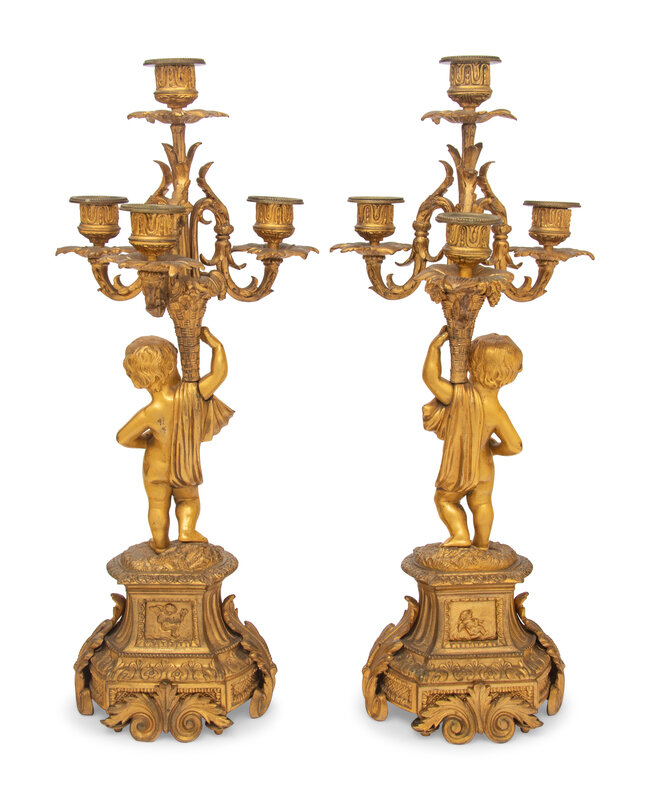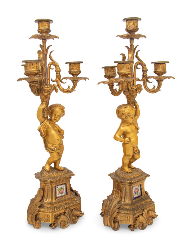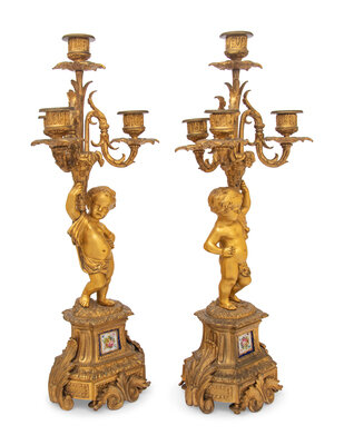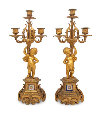 A Pair of French Gilt Bronze and Porcelain Inset Four-Light Candelabra