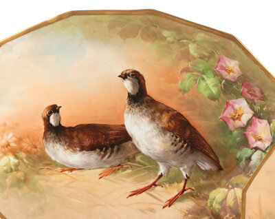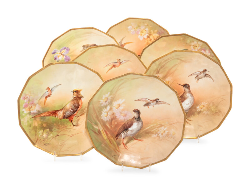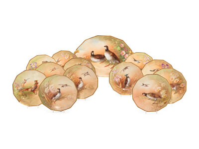 comprising a platter and a set of twelve plates, each with a different painted scene of game birds signed 'Dubois'; 13 items total.