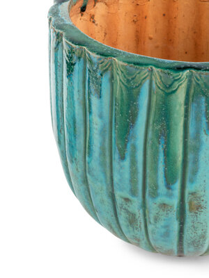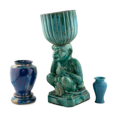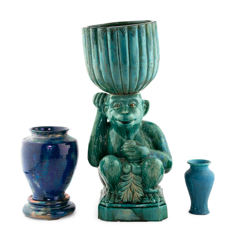both of baluster form, one with a matching stand, together with a modern glazed earthenware planter with a monkey-form stand.