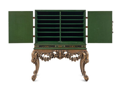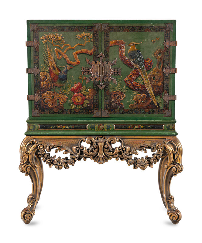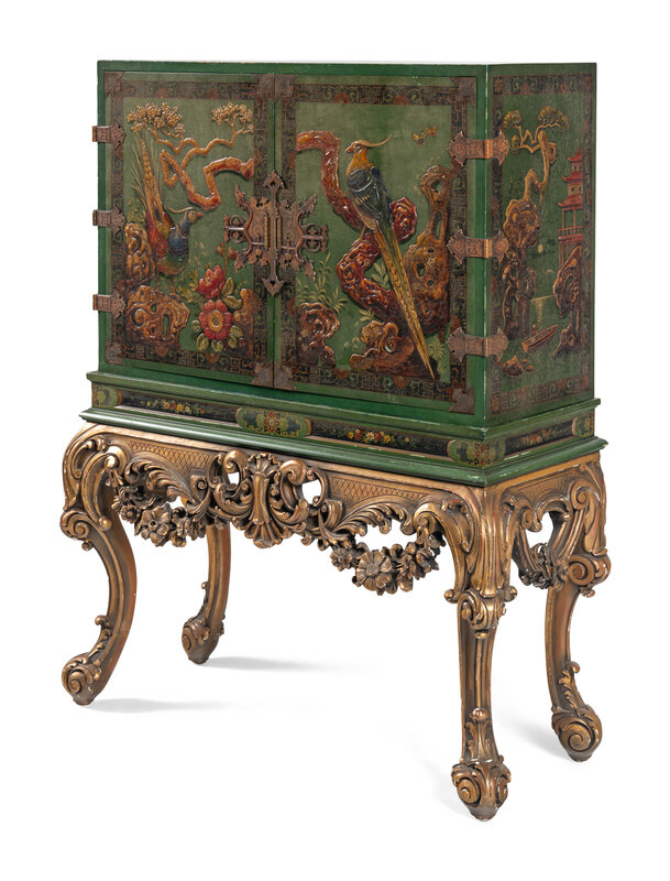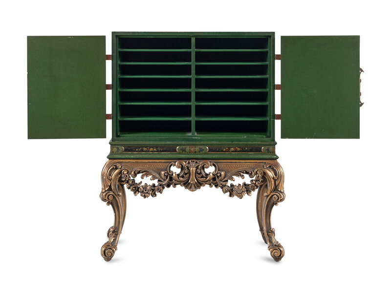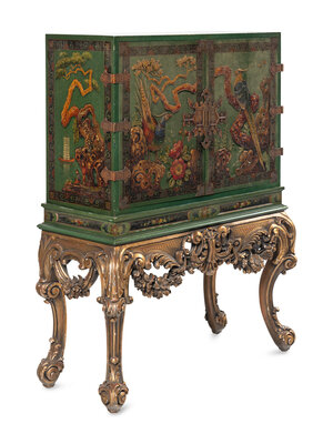 A George I Style Green-Japanned Cabinet on a Giltwood Stand