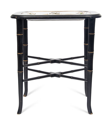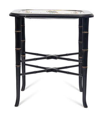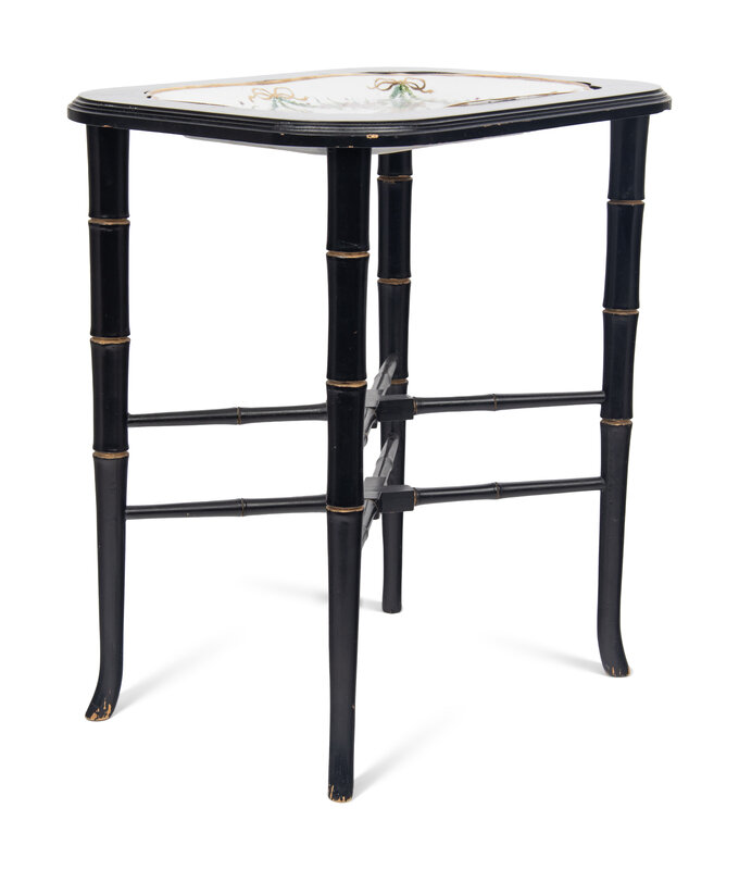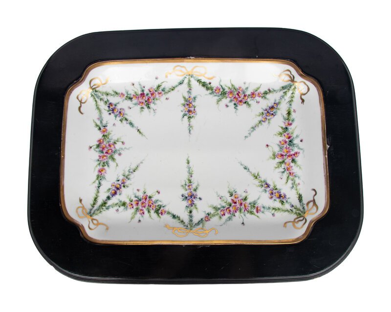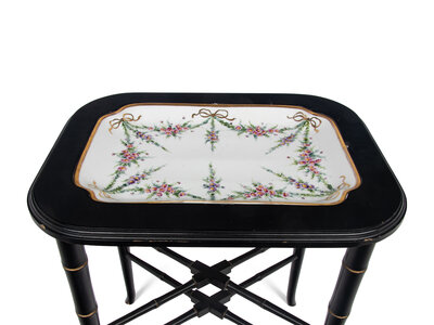 A German Porcelain Tray Set in a Later Ebonized Side Table