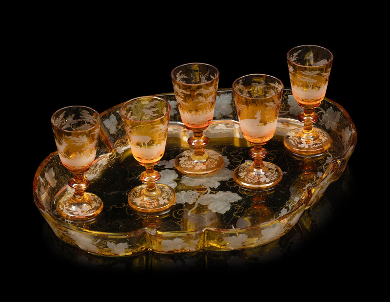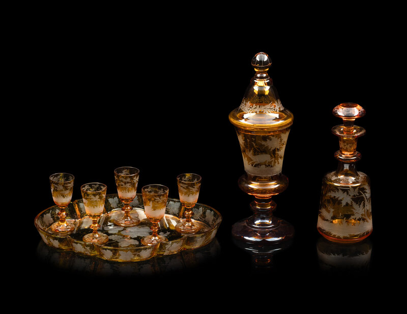 comprising one pokal, one decanter, five cordials, and a similar tray; 8 items total.
