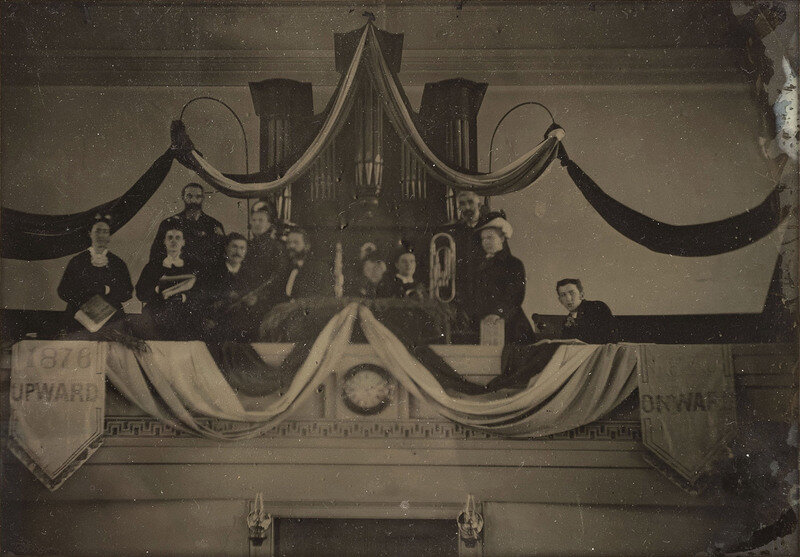 5 1/4 x 7 1/2 in. (visible) ambrotype, matted and housed in an 11 x 13 in. folk art wooden frame. A group of men and women pose together with instruments in the organ loft of a church, draped with bunting and two banners reading, "1876 / Upward" and "1620 / Onward."