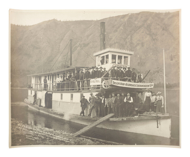 19 5/8 x 15 7/8 in. silver gelatin photograph. Titled, dated, and credited to Goetzman in the negative. A mammoth plate gold rush photograph. Men and women stand on the decks of the steamer Flora, with large signage reading "Royal Mail," and "This Life Boat is Reserved As A Stateroom for Goetzman, The Dawson Photographer."