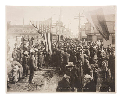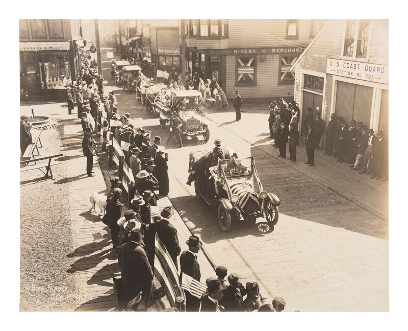 [With:] 9 1/4 x 7 3/8 in. silver gelatin photograph of an Independence Day parade in Nome, Alaska by Lomen Bros, 4 July 1917. Captioned and credited in the negative. Vehicles decorated with American flags drive down a paved road lined with spectators. The storefronts also display American flags in the windows.