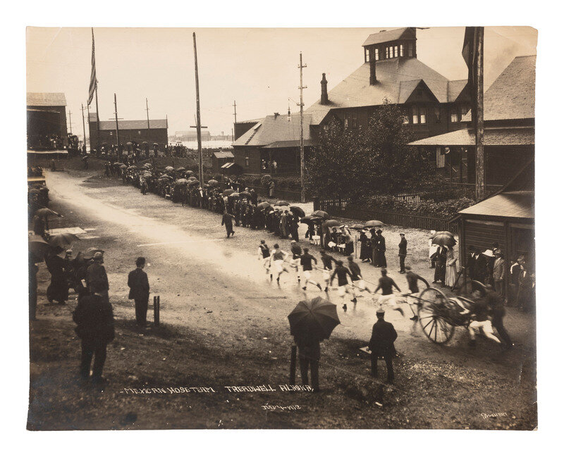 Treadwell was home to four gold mines including the Mexican Mine and the Ready Bullion Mine. It seems that each mine had its own hose team, and perhaps what is captured in this image is a race that took place as part of Independence Day festivities in the town.