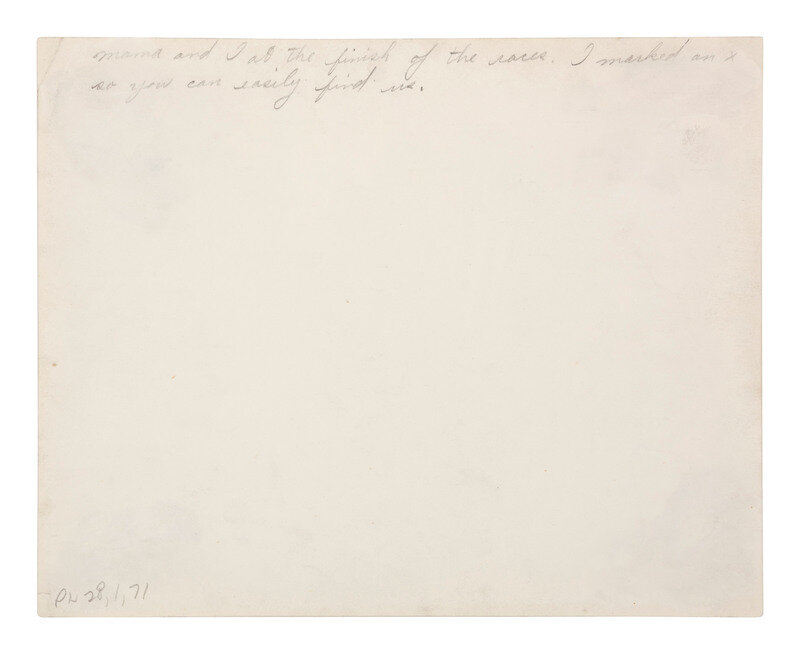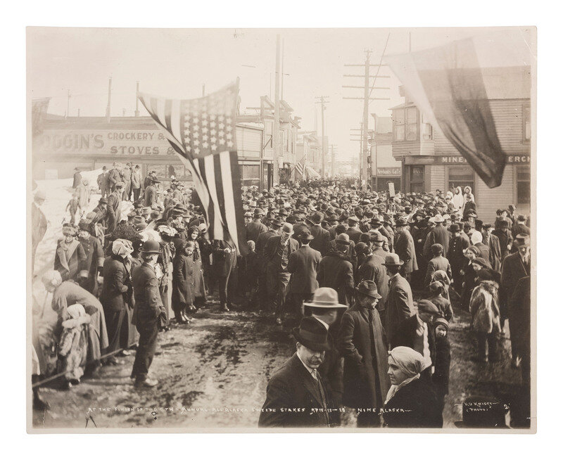 10 x 8 in. silver gelatin photograph featuring a large crowd of people gathered near the finish line of the "6th Annual All Alaska Sweepe [sic] Stakes" in Nome by H. G. Kaiser, 1913. Captioned and credited in the negative. Verso with pencil inscription reading, "mama and I at the finish of the races. I marked an x so you can easily find us." To the left side of the image, two women in coats and fur hats can be seen walking in the direction of the camera, and there are two small penciled "x" marks over their heads.