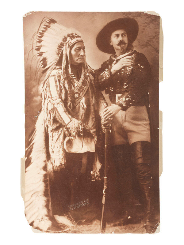 A full-length view of "Buffalo Bill" Cody holding his Winchester, posed with Sioux Chief Sitting Bull, who toured with the Wild West show for about five months during the 1885 season. Although originally taken by the Notman Studio while the show was in Montreal, this image was printed by D.F. Barry around the turn of the century from an original negative.