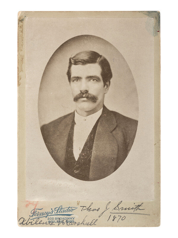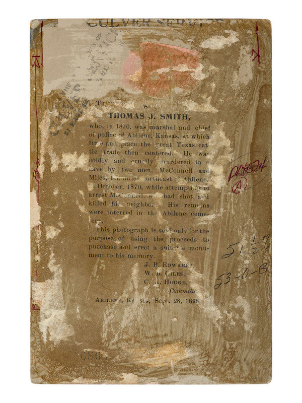 5 1/2 x 4 in. silver gelatin photograph (including margins) on cardstock mount, with manuscript identification in lower margin and imprint of Forney's Studio of Abilene, ca 1899. With printed information on mount verso identifying the subject as Marshall in 1870, who was murdered while attempting an arrest. The card was sold to raise funds for a monument in Smith's honor.