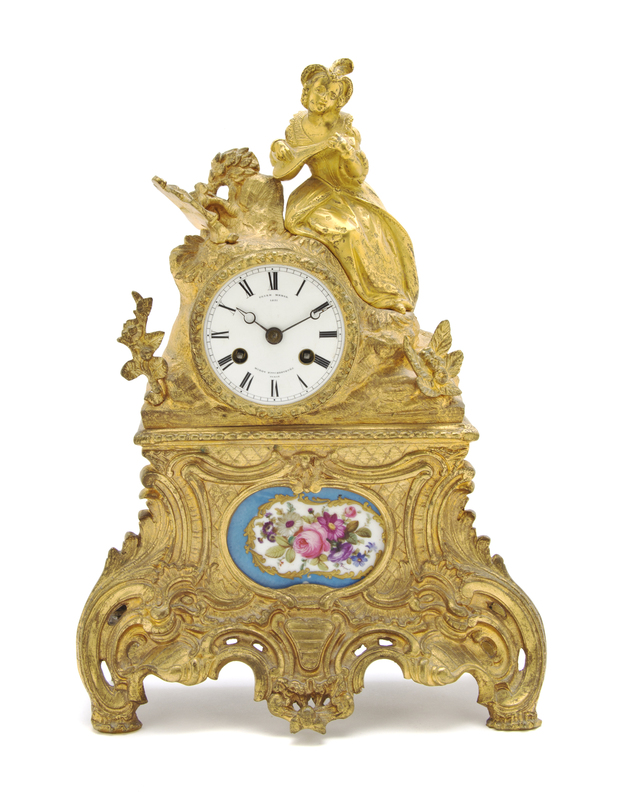 A French Gilt Metal and Sevres Style Porcelain Inset Figural Mantel Clock, Miroy Freres,