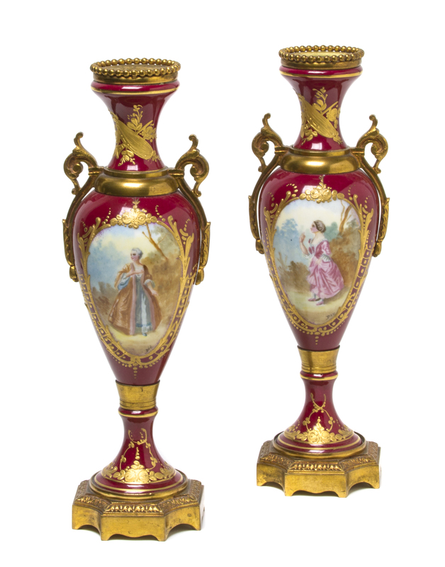 A Pair of Sevres Style Porcelain and Gilt Metal Mounted Urns,