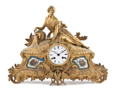 A Gilt Bronze and Sevres Style Porcelain Mounted Figural Mantel Clock,
