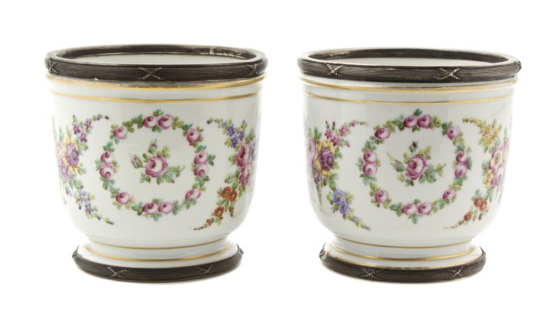 A Pair of Sevres Style Porcelain and French Silver Mounted Cache Pots,