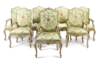 A Set of Eight Louis XV Style Giltwood Fauteuils,