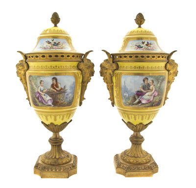 A Pair of Sevres Style Porcelain and Gilt Metal Mounted Covered Urns,